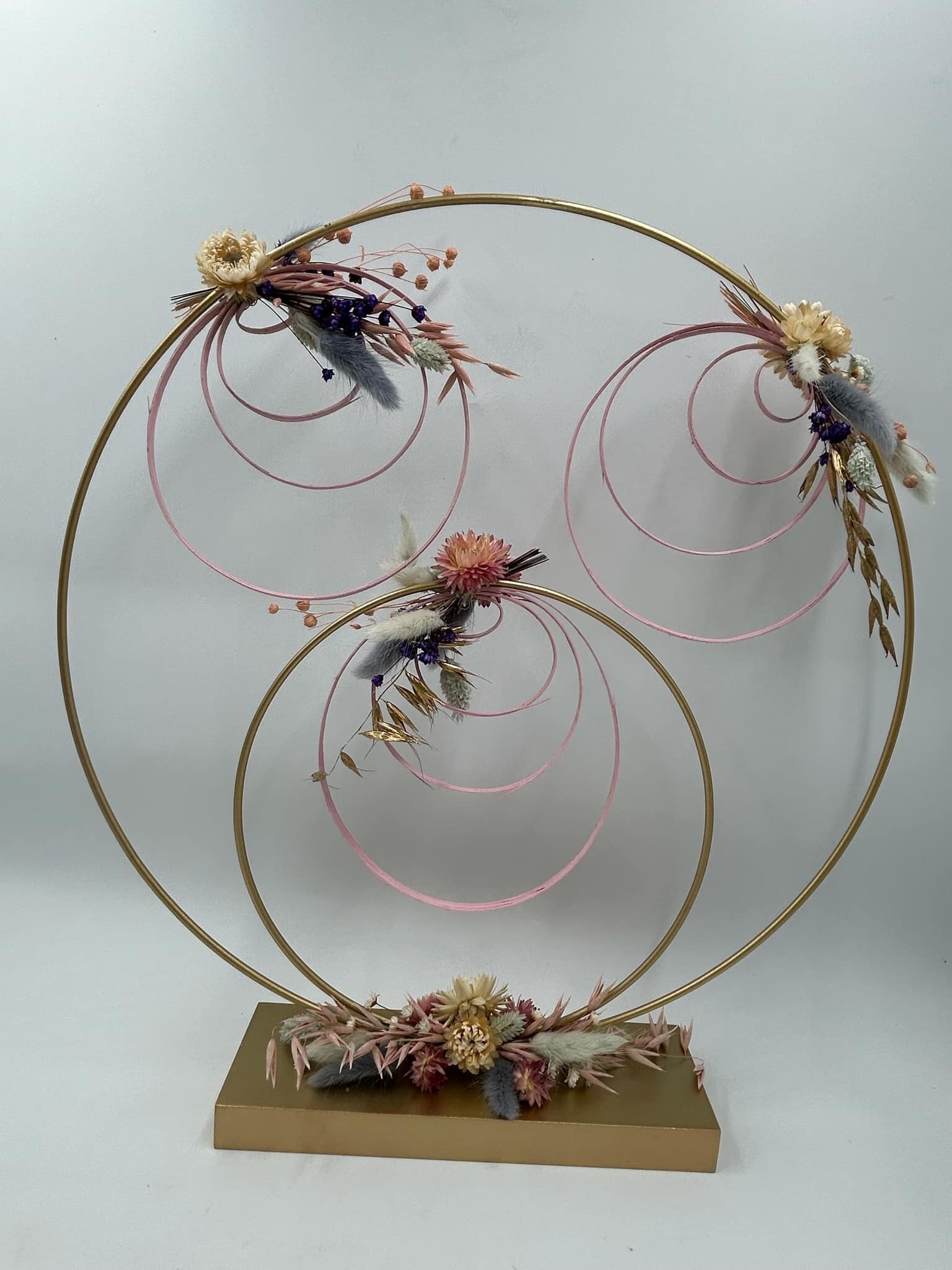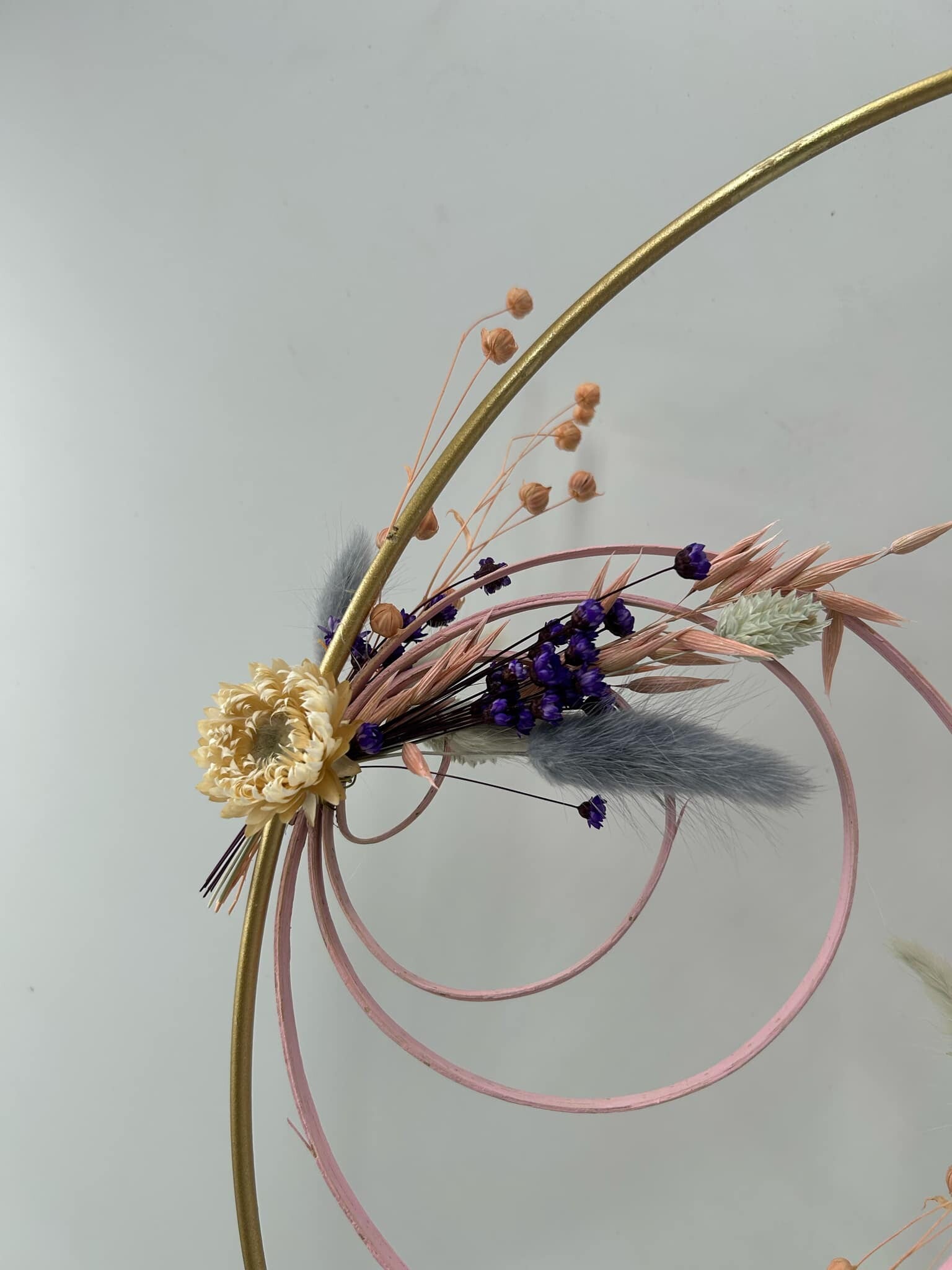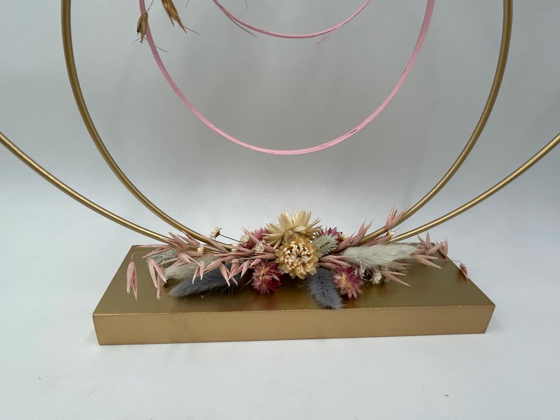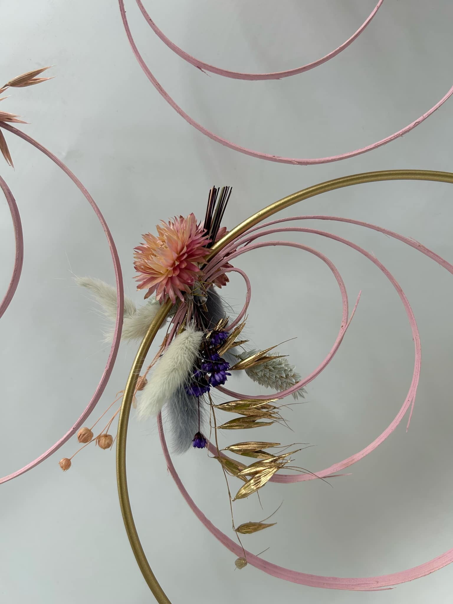 Goudkleurige decoratiecirkel versierd met droogloemen.
